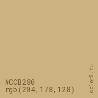 Цвет #CCB280 в цветовой модели RGB обозначается тремя октетами (204, 178, 128) в десятичном формате и #CCB280 в шестнадцатиричном (hex) формате, которые являются интенсивностью красного 204 (hex CC), интенсивность зелёного 178 (hex B2) и интенсивность синего 128 (hex 80).