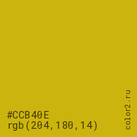 Цвет #CCB40E в цветовой модели RGB обозначается тремя октетами (204, 180, 14) в десятичном формате и #CCB40E в шестнадцатиричном (hex) формате, которые являются интенсивностью красного 204 (hex CC), интенсивность зелёного 180 (hex B4) и интенсивность синего 14 (hex 0E).