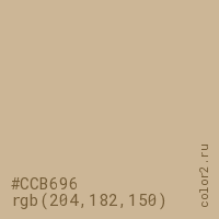 Цвет #CCB696 в цветовой модели RGB обозначается тремя октетами (204, 182, 150) в десятичном формате и #CCB696 в шестнадцатиричном (hex) формате, которые являются интенсивностью красного 204 (hex CC), интенсивность зелёного 182 (hex B6) и интенсивность синего 150 (hex 96).
