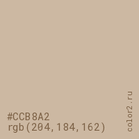 Цвет #CCB8A2 в цветовой модели RGB обозначается тремя октетами (204, 184, 162) в десятичном формате и #CCB8A2 в шестнадцатиричном (hex) формате, которые являются интенсивностью красного 204 (hex CC), интенсивность зелёного 184 (hex B8) и интенсивность синего 162 (hex A2).