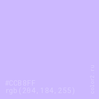 Цвет #CCB8FF в цветовой модели RGB обозначается тремя октетами (204, 184, 255) в десятичном формате и #CCB8FF в шестнадцатиричном (hex) формате, которые являются интенсивностью красного 204 (hex CC), интенсивность зелёного 184 (hex B8) и интенсивность синего 255 (hex FF).