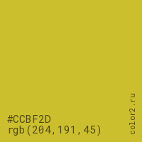 Цвет #CCBF2D в цветовой модели RGB обозначается тремя октетами (204, 191, 45) в десятичном формате и #CCBF2D в шестнадцатиричном (hex) формате, которые являются интенсивностью красного 204 (hex CC), интенсивность зелёного 191 (hex BF) и интенсивность синего 45 (hex 2D).