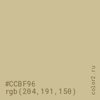Цвет #CCBF96 в цветовой модели RGB обозначается тремя октетами (204, 191, 150) в десятичном формате и #CCBF96 в шестнадцатиричном (hex) формате, которые являются интенсивностью красного 204 (hex CC), интенсивность зелёного 191 (hex BF) и интенсивность синего 150 (hex 96).