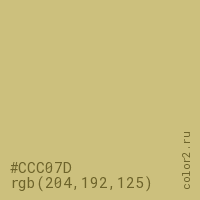 Цвет #CCC07D в цветовой модели RGB обозначается тремя октетами (204, 192, 125) в десятичном формате и #CCC07D в шестнадцатиричном (hex) формате, которые являются интенсивностью красного 204 (hex CC), интенсивность зелёного 192 (hex C0) и интенсивность синего 125 (hex 7D).