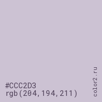 Цвет #CCC2D3 в цветовой модели RGB обозначается тремя октетами (204, 194, 211) в десятичном формате и #CCC2D3 в шестнадцатиричном (hex) формате, которые являются интенсивностью красного 204 (hex CC), интенсивность зелёного 194 (hex C2) и интенсивность синего 211 (hex D3).