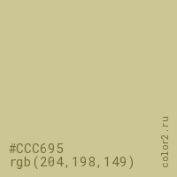 Цвет #CCC695 в цветовой модели RGB обозначается тремя октетами (204, 198, 149) в десятичном формате и #CCC695 в шестнадцатиричном (hex) формате, которые являются интенсивностью красного 204 (hex CC), интенсивность зелёного 198 (hex C6) и интенсивность синего 149 (hex 95).