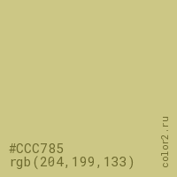 Цвет #CCC785 в цветовой модели RGB обозначается тремя октетами (204, 199, 133) в десятичном формате и #CCC785 в шестнадцатиричном (hex) формате, которые являются интенсивностью красного 204 (hex CC), интенсивность зелёного 199 (hex C7) и интенсивность синего 133 (hex 85).