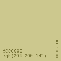 Цвет #CCC88E в цветовой модели RGB обозначается тремя октетами (204, 200, 142) в десятичном формате и #CCC88E в шестнадцатиричном (hex) формате, которые являются интенсивностью красного 204 (hex CC), интенсивность зелёного 200 (hex C8) и интенсивность синего 142 (hex 8E).