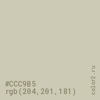 Цвет #CCC9B5 в цветовой модели RGB обозначается тремя октетами (204, 201, 181) в десятичном формате и #CCC9B5 в шестнадцатиричном (hex) формате, которые являются интенсивностью красного 204 (hex CC), интенсивность зелёного 201 (hex C9) и интенсивность синего 181 (hex B5).