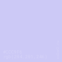 Цвет #CCC9F6 в цветовой модели RGB обозначается тремя октетами (204, 201, 246) в десятичном формате и #CCC9F6 в шестнадцатиричном (hex) формате, которые являются интенсивностью красного 204 (hex CC), интенсивность зелёного 201 (hex C9) и интенсивность синего 246 (hex F6).