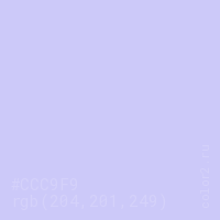 Цвет RGB(204, 201, 249) в процентом отношении количества цвета состоит из 80% красного (red), 78.8% зелёного (green) и 97.6% синего (blue).