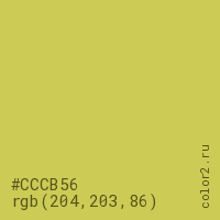 Цвет #CCCB56 в цветовой модели RGB обозначается тремя октетами (204, 203, 86) в десятичном формате и #CCCB56 в шестнадцатиричном (hex) формате, которые являются интенсивностью красного 204 (hex CC), интенсивность зелёного 203 (hex CB) и интенсивность синего 86 (hex 56).