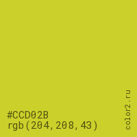 Цвет #CCD02B в цветовой модели RGB обозначается тремя октетами (204, 208, 43) в десятичном формате и #CCD02B в шестнадцатиричном (hex) формате, которые являются интенсивностью красного 204 (hex CC), интенсивность зелёного 208 (hex D0) и интенсивность синего 43 (hex 2B).
