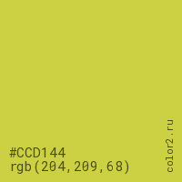 Цвет #CCD144 в цветовой модели RGB обозначается тремя октетами (204, 209, 68) в десятичном формате и #CCD144 в шестнадцатиричном (hex) формате, которые являются интенсивностью красного 204 (hex CC), интенсивность зелёного 209 (hex D1) и интенсивность синего 68 (hex 44).