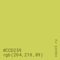Цвет #CCD259 в цветовой модели RGB обозначается тремя октетами (204, 210, 89) в десятичном формате и #CCD259 в шестнадцатиричном (hex) формате, которые являются интенсивностью красного 204 (hex CC), интенсивность зелёного 210 (hex D2) и интенсивность синего 89 (hex 59).