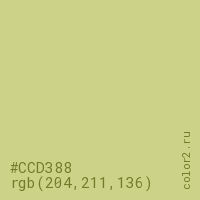 Цвет #CCD388 в цветовой модели RGB обозначается тремя октетами (204, 211, 136) в десятичном формате и #CCD388 в шестнадцатиричном (hex) формате, которые являются интенсивностью красного 204 (hex CC), интенсивность зелёного 211 (hex D3) и интенсивность синего 136 (hex 88).