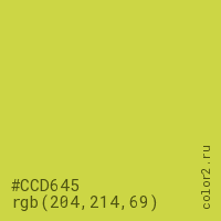 Цвет #CCD645 в цветовой модели RGB обозначается тремя октетами (204, 214, 69) в десятичном формате и #CCD645 в шестнадцатиричном (hex) формате, которые являются интенсивностью красного 204 (hex CC), интенсивность зелёного 214 (hex D6) и интенсивность синего 69 (hex 45).