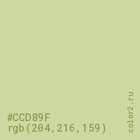Цвет #CCD89F в цветовой модели RGB обозначается тремя октетами (204, 216, 159) в десятичном формате и #CCD89F в шестнадцатиричном (hex) формате, которые являются интенсивностью красного 204 (hex CC), интенсивность зелёного 216 (hex D8) и интенсивность синего 159 (hex 9F).