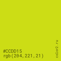 Цвет #CCDD15 в цветовой модели RGB обозначается тремя октетами (204, 221, 21) в десятичном формате и #CCDD15 в шестнадцатиричном (hex) формате, которые являются интенсивностью красного 204 (hex CC), интенсивность зелёного 221 (hex DD) и интенсивность синего 21 (hex 15).