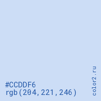 Цвет #CCDDF6 в цветовой модели RGB обозначается тремя октетами (204, 221, 246) в десятичном формате и #CCDDF6 в шестнадцатиричном (hex) формате, которые являются интенсивностью красного 204 (hex CC), интенсивность зелёного 221 (hex DD) и интенсивность синего 246 (hex F6).