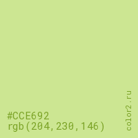 Цвет #CCE692 в цветовой модели RGB обозначается тремя октетами (204, 230, 146) в десятичном формате и #CCE692 в шестнадцатиричном (hex) формате, которые являются интенсивностью красного 204 (hex CC), интенсивность зелёного 230 (hex E6) и интенсивность синего 146 (hex 92).