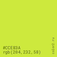 Цвет #CCE83A в цветовой модели RGB обозначается тремя октетами (204, 232, 58) в десятичном формате и #CCE83A в шестнадцатиричном (hex) формате, которые являются интенсивностью красного 204 (hex CC), интенсивность зелёного 232 (hex E8) и интенсивность синего 58 (hex 3A).
