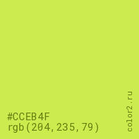 Цвет #CCEB4F в цветовой модели RGB обозначается тремя октетами (204, 235, 79) в десятичном формате и #CCEB4F в шестнадцатиричном (hex) формате, которые являются интенсивностью красного 204 (hex CC), интенсивность зелёного 235 (hex EB) и интенсивность синего 79 (hex 4F).