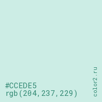 Цвет #CCEDE5 в цветовой модели RGB обозначается тремя октетами (204, 237, 229) в десятичном формате и #CCEDE5 в шестнадцатиричном (hex) формате, которые являются интенсивностью красного 204 (hex CC), интенсивность зелёного 237 (hex ED) и интенсивность синего 229 (hex E5).