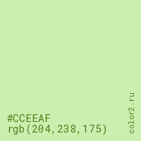 Цвет #CCEEAF в цветовой модели RGB обозначается тремя октетами (204, 238, 175) в десятичном формате и #CCEEAF в шестнадцатиричном (hex) формате, которые являются интенсивностью красного 204 (hex CC), интенсивность зелёного 238 (hex EE) и интенсивность синего 175 (hex AF).