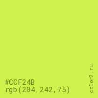 Цвет #CCF24B в цветовой модели RGB обозначается тремя октетами (204, 242, 75) в десятичном формате и #CCF24B в шестнадцатиричном (hex) формате, которые являются интенсивностью красного 204 (hex CC), интенсивность зелёного 242 (hex F2) и интенсивность синего 75 (hex 4B).