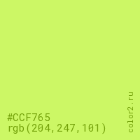 Цвет #CCF765 в цветовой модели RGB обозначается тремя октетами (204, 247, 101) в десятичном формате и #CCF765 в шестнадцатиричном (hex) формате, которые являются интенсивностью красного 204 (hex CC), интенсивность зелёного 247 (hex F7) и интенсивность синего 101 (hex 65).