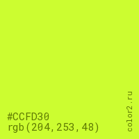 Цвет #CCFD30 в цветовой модели RGB обозначается тремя октетами (204, 253, 48) в десятичном формате и #CCFD30 в шестнадцатиричном (hex) формате, которые являются интенсивностью красного 204 (hex CC), интенсивность зелёного 253 (hex FD) и интенсивность синего 48 (hex 30).