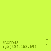 Цвет #CCFD45 в цветовой модели RGB обозначается тремя октетами (204, 253, 69) в десятичном формате и #CCFD45 в шестнадцатиричном (hex) формате, которые являются интенсивностью красного 204 (hex CC), интенсивность зелёного 253 (hex FD) и интенсивность синего 69 (hex 45).