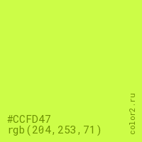 Цвет #CCFD47 в цветовой модели RGB обозначается тремя октетами (204, 253, 71) в десятичном формате и #CCFD47 в шестнадцатиричном (hex) формате, которые являются интенсивностью красного 204 (hex CC), интенсивность зелёного 253 (hex FD) и интенсивность синего 71 (hex 47).