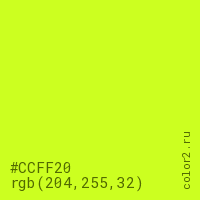 Цвет #CCFF20 в цветовой модели RGB обозначается тремя октетами (204, 255, 32) в десятичном формате и #CCFF20 в шестнадцатиричном (hex) формате, которые являются интенсивностью красного 204 (hex CC), интенсивность зелёного 255 (hex FF) и интенсивность синего 32 (hex 20).