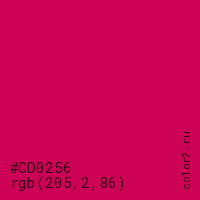Цвет #CD0256 в цветовой модели RGB обозначается тремя октетами (205, 2, 86) в десятичном формате и #CD0256 в шестнадцатиричном (hex) формате, которые являются интенсивностью красного 205 (hex CD), интенсивность зелёного 2 (hex 02) и интенсивность синего 86 (hex 56).