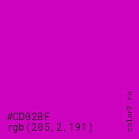Цвет #CD02BF в цветовой модели RGB обозначается тремя октетами (205, 2, 191) в десятичном формате и #CD02BF в шестнадцатиричном (hex) формате, которые являются интенсивностью красного 205 (hex CD), интенсивность зелёного 2 (hex 02) и интенсивность синего 191 (hex BF).