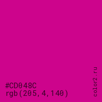 Цвет #CD048C в цветовой модели RGB обозначается тремя октетами (205, 4, 140) в десятичном формате и #CD048C в шестнадцатиричном (hex) формате, которые являются интенсивностью красного 205 (hex CD), интенсивность зелёного 4 (hex 04) и интенсивность синего 140 (hex 8C).