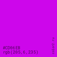 Цвет #CD06EB в цветовой модели RGB обозначается тремя октетами (205, 6, 235) в десятичном формате и #CD06EB в шестнадцатиричном (hex) формате, которые являются интенсивностью красного 205 (hex CD), интенсивность зелёного 6 (hex 06) и интенсивность синего 235 (hex EB).