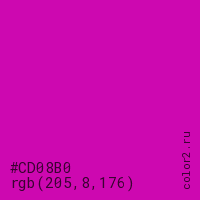 Цвет #CD08B0 в цветовой модели RGB обозначается тремя октетами (205, 8, 176) в десятичном формате и #CD08B0 в шестнадцатиричном (hex) формате, которые являются интенсивностью красного 205 (hex CD), интенсивность зелёного 8 (hex 08) и интенсивность синего 176 (hex B0).