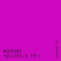 Цвет #CD08BF в цветовой модели RGB обозначается тремя октетами (205, 8, 191) в десятичном формате и #CD08BF в шестнадцатиричном (hex) формате, которые являются интенсивностью красного 205 (hex CD), интенсивность зелёного 8 (hex 08) и интенсивность синего 191 (hex BF).