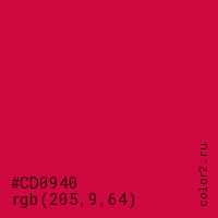 Цвет #CD0940 в цветовой модели RGB обозначается тремя октетами (205, 9, 64) в десятичном формате и #CD0940 в шестнадцатиричном (hex) формате, которые являются интенсивностью красного 205 (hex CD), интенсивность зелёного 9 (hex 09) и интенсивность синего 64 (hex 40).