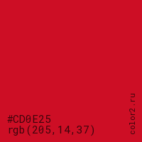 Цвет #CD0E25 в цветовой модели RGB обозначается тремя октетами (205, 14, 37) в десятичном формате и #CD0E25 в шестнадцатиричном (hex) формате, которые являются интенсивностью красного 205 (hex CD), интенсивность зелёного 14 (hex 0E) и интенсивность синего 37 (hex 25).