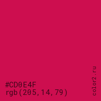 Цвет #CD0E4F в цветовой модели RGB обозначается тремя октетами (205, 14, 79) в десятичном формате и #CD0E4F в шестнадцатиричном (hex) формате, которые являются интенсивностью красного 205 (hex CD), интенсивность зелёного 14 (hex 0E) и интенсивность синего 79 (hex 4F).