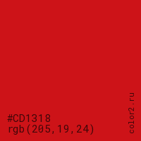Цвет #CD1318 в цветовой модели RGB обозначается тремя октетами (205, 19, 24) в десятичном формате и #CD1318 в шестнадцатиричном (hex) формате, которые являются интенсивностью красного 205 (hex CD), интенсивность зелёного 19 (hex 13) и интенсивность синего 24 (hex 18).