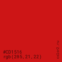 Цвет #CD1516 в цветовой модели RGB обозначается тремя октетами (205, 21, 22) в десятичном формате и #CD1516 в шестнадцатиричном (hex) формате, которые являются интенсивностью красного 205 (hex CD), интенсивность зелёного 21 (hex 15) и интенсивность синего 22 (hex 16).