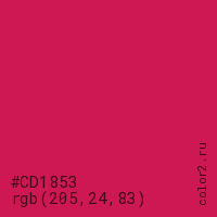 Цвет #CD1853 в цветовой модели RGB обозначается тремя октетами (205, 24, 83) в десятичном формате и #CD1853 в шестнадцатиричном (hex) формате, которые являются интенсивностью красного 205 (hex CD), интенсивность зелёного 24 (hex 18) и интенсивность синего 83 (hex 53).