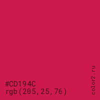 Цвет #CD194C в цветовой модели RGB обозначается тремя октетами (205, 25, 76) в десятичном формате и #CD194C в шестнадцатиричном (hex) формате, которые являются интенсивностью красного 205 (hex CD), интенсивность зелёного 25 (hex 19) и интенсивность синего 76 (hex 4C).
