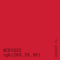 Цвет #CD1D32 в цветовой модели RGB обозначается тремя октетами (205, 29, 50) в десятичном формате и #CD1D32 в шестнадцатиричном (hex) формате, которые являются интенсивностью красного 205 (hex CD), интенсивность зелёного 29 (hex 1D) и интенсивность синего 50 (hex 32).