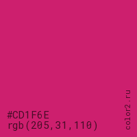 Цвет #CD1F6E в цветовой модели RGB обозначается тремя октетами (205, 31, 110) в десятичном формате и #CD1F6E в шестнадцатиричном (hex) формате, которые являются интенсивностью красного 205 (hex CD), интенсивность зелёного 31 (hex 1F) и интенсивность синего 110 (hex 6E).